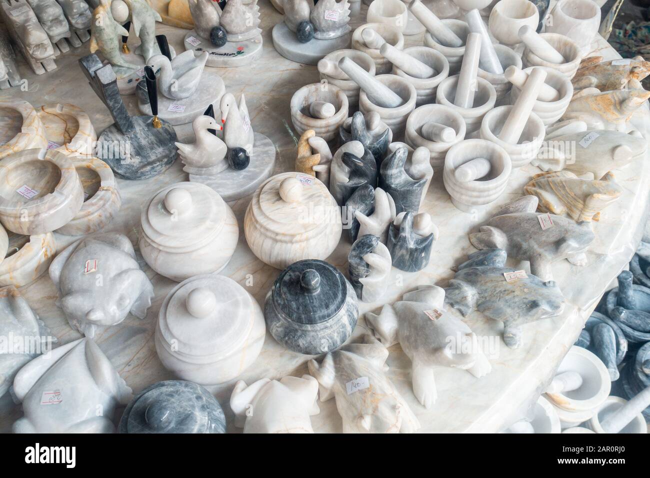 The portfolio ranges from handmade sculptures statues small souvenirs such as desk sets ashtrays mortar trailer up to complete marble tiles and floor tiles as well as urns.