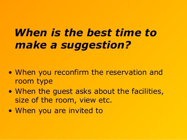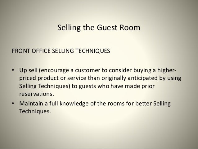 Selling the hotel recognize when you have an opportunity to sell listen to the guest s needs recommend the facilities and services take the opportunity to sell a better service or product 8.
