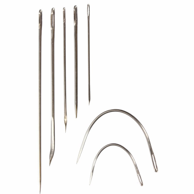 The handy needle set includes different needles which are glovers needle carpet needle sail needle straight upholstery needle sack needle and 2 pieces of curved mattress needles.