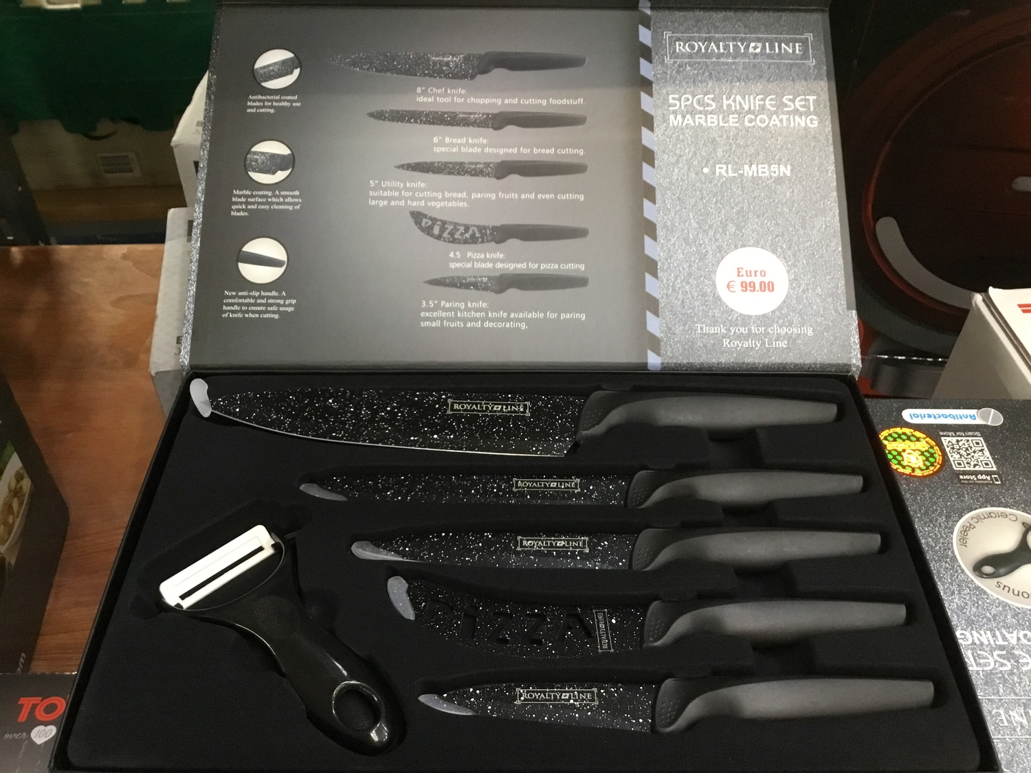 5 piece knife set in gift box as in image with marble non stick coating on knives and free ceramic peeler new anti slip handle and strong grip handle to ensure safe usage of knife when cutting.