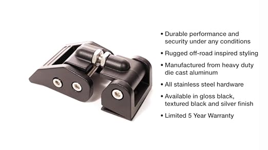 The aluminum hood catch kits are available in a stylish silver or black powder coated finish.