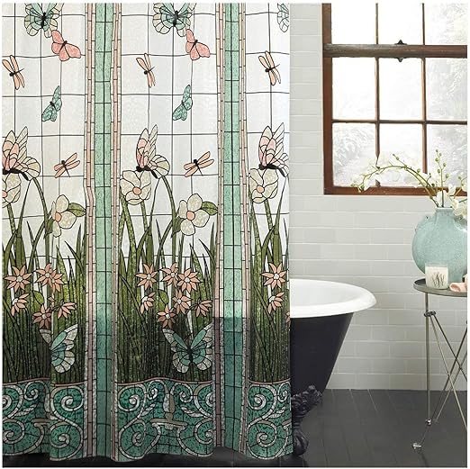 Peva vinyl stained glass meadow shower curtain bath decor butterfly flower aqua.